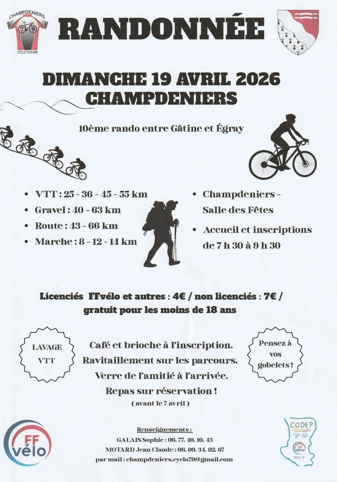 Le club cyclos "Champdeniers cyclotourisme" vous invite le dimanche 19 avril à leur traditionnelle randonnée ou chacun pourra choisir son sport favori (marche, vélo, vtt, Gravel).