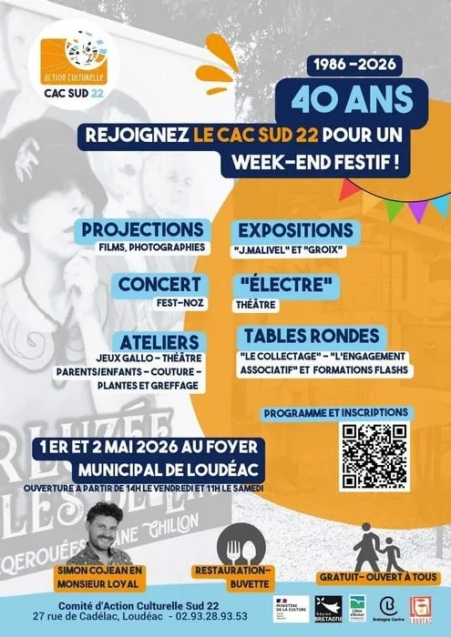 40 ans du CAC Sud 222026 marque un anniversaire important pour notre association : 40 ans à vos côtés, 40 ans de projets, de culture, d’éducation populaire, de liens… 40 ans pour vous, avec vous, grâce à vous !Alors pour fêter ça et insuffler le mouvement pour les 40 prochaines années !De la musique, des conférences, des ateliers, un spectacle…Bref, de la joie à partager, et tout ça gratuitement !Programme complet : https://www.cacsud22.com/40-ans-partager-stif-et-culturel