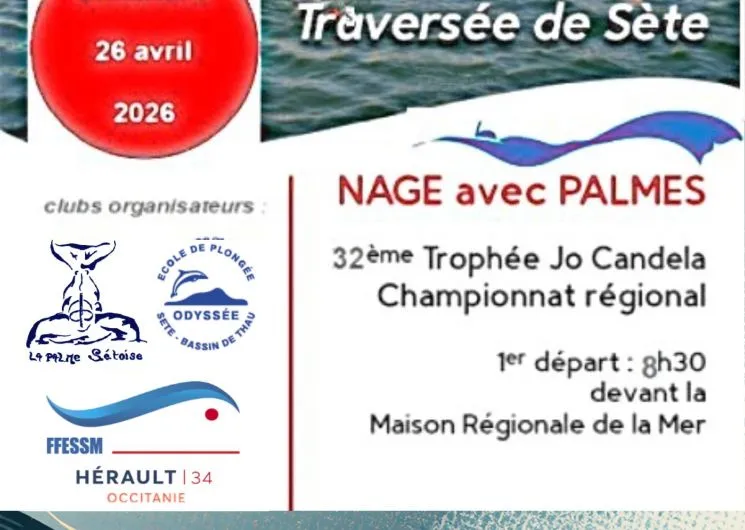 Dimanche 26 avril 2026, La Palme Sétoise, le club de l’Odyssée de Sète, les Commissions de Nage avec Palmes du Comité Départemental de l’Hérault et du Comité Inter-Régional Pyrénées Méditerranée, organisent la 55ème Traversée de SETE de Nage avec Palmes, 32ème Trophée JO CANDELA et Championnat régional et départemental de l’Hérault de Nage avec Palmes d’Eau Libre.Cette traversée est aussi la sélection départementale et régionale pour la qualification au Championnat de France de Longue Distance.Cette compétition se déroulera dans les canaux de la ville, à partir de 8h30. Départs et arrivées devant la Maison Régionale de la Mer ( ex Chambre de Commerce de Sète).5 courses sont prévues:6 000 m : seniors hommes, seniors dames, juniors, cadets, Masters , supports3 000 m : minimes + parcours promotionnel + supports2 000 m : benjamins950 m : poussins, + parcours promotionnel + supports3h : Cadets, juniors, Seniors, MastersProgramme:08h15 : remise des dossards, quai Philippe Régy (devant la Chambre de Commerce de Sète)8h30 : départ du 3h cadets, espoirs, seniors, vétérans09h15 : départ du 950m toutes catégories09h30 : départ du 2000m, 3000 m et du 6000 m toutes catégories12h00 : remise des récompenses, au gymnase Paul Di Stephano, suivi d’un vin d’honneur.Les inscriptions sur Hello Asso avant le 17 avril 2026 – Midi