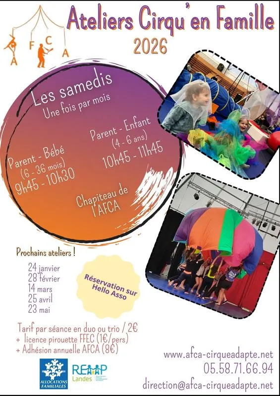 L'AFCA propose un atelier "Cirqu'en famille parent/bébé" (de 6 à 36 mois) 1 samedi par mois de 9h45 à 10h30, jeux, éveil et motricité par le biais des arts du cirque.