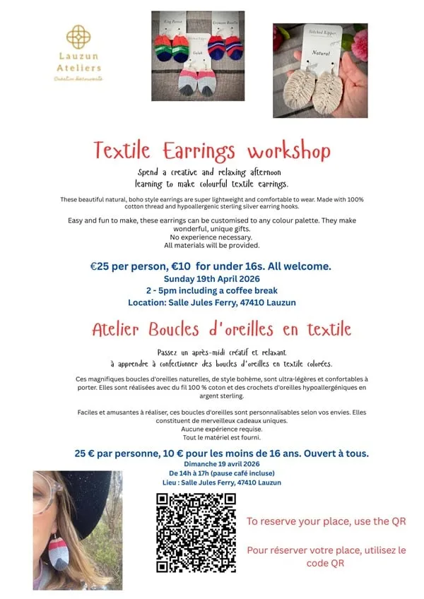 L'association Lauzun : Ateliers, Création, Découverte vous invite à un atelier boucles d'oreilles en textile. Tout le matériel est fourni. Sur réservation, le nombre de places est limité.