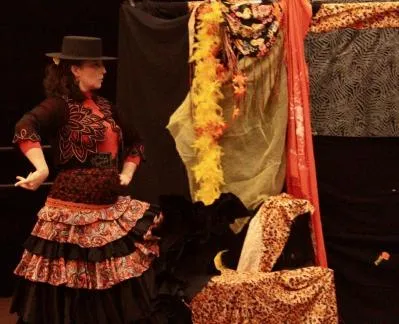 Suivi du spectacle Les mals aimés : Spectacle seule en scène où la conteuse a choisi de piocher dans les éléments du Flamenco (les percussions avec les pieds ou les mains, l’utilisation du châle, la musique, la danse…) pour faire vivre ses personnages.