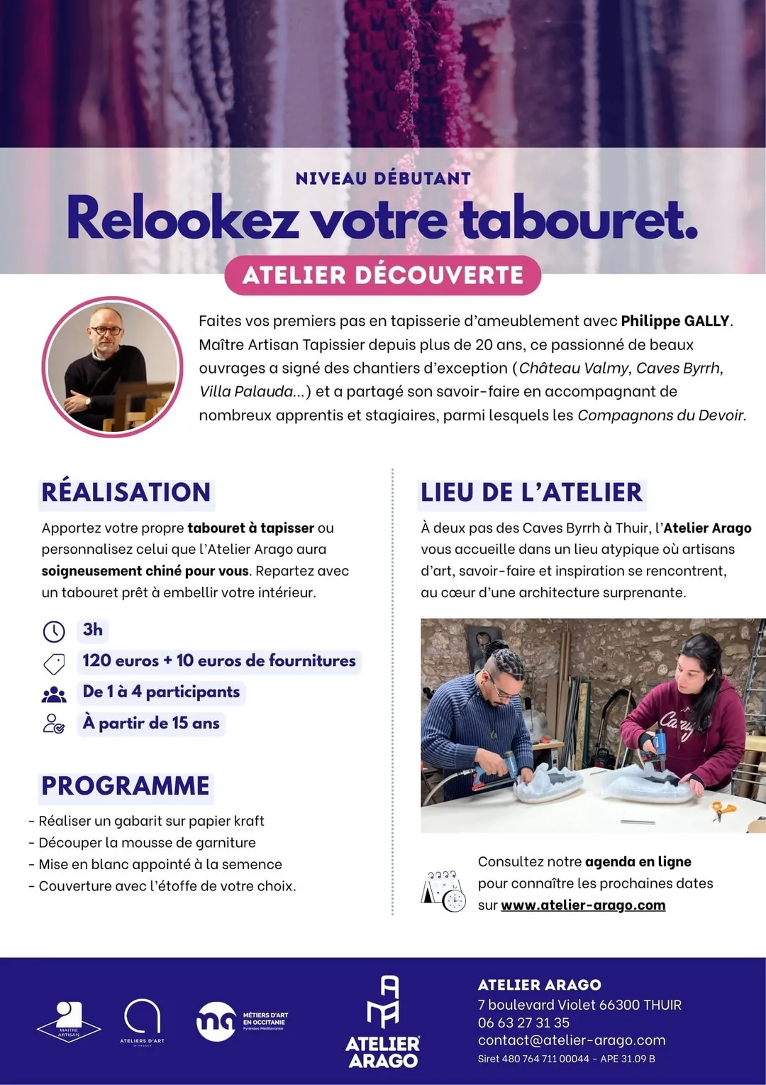 Apportez votre propre tabouret à tapisser ou personnalisez celui que l'Atelier Arago aura soigneusement chiné pour vous. Repartez avec un tabouret prêt à ...