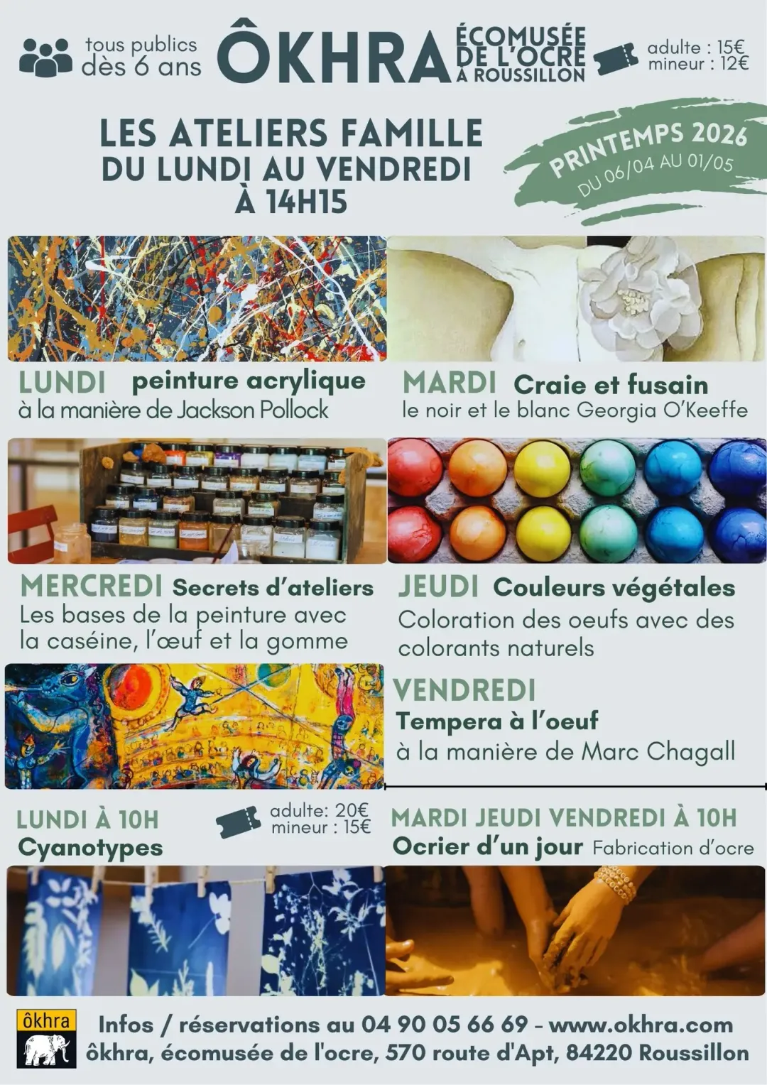 Pendant les vacances scolaires de Pâques, l'écomusée de l'ocre vous propose de jouer avec les couleurs et les pigments au cours d'ateliers créatifs tous publics, d'apprendre à fabriquer vos peintures naturelles avec des œufs, du fromage blanc, des gommes.