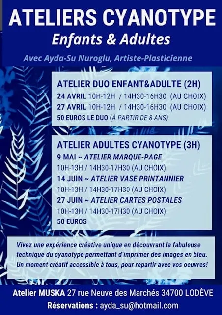 Vivez une expérience unique en découvrant la technique du cyanotype! Il s'agit d'un processus artisanal fascinant, entre chimie et magie ! Cette technique du Cyanotype, technique très ancienne et alternative de la photo, permet d’imprimer des images (végétaux, dessin ou photo) en bleu de Prusse, grâce au rayonnement de la lumière. Pas besoin de savoir dessiner, le plaisir avant tout avec cette technique riche et accessible à tous !