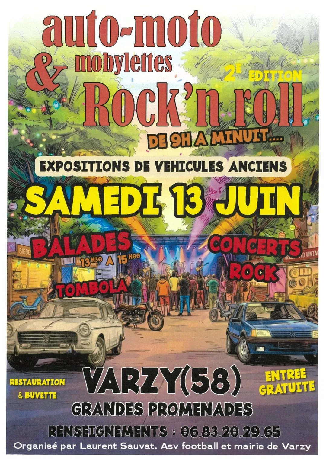 Auto-moto mobylettes & Rock'n roll 2ème édition - Exposition de véhicules anciens, tombola, balades (de 13h30 à 15h), concerts rock - Entrée gratuite - Buvette et restauration sur place - Renseignements : 06-83-20-29-65 - Organisé par la mairie de Varzy, l'A.S. Varzy Foot et Laurent Sauvat.