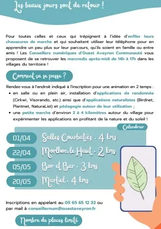 Pour toute celles et ceux qui trépignent à l’idée d’enfiler leurs chaussures de marche et qui souhaitent utiliser leur téléphone pour en apprendre un peu plus sur leurs parcours, qu’ils soient en famille ou entre amis ! Les Conseillers numériques d’Ouest Aveyron Communauté vous proposent de se retrouver les mercredi après midi. Animation en deux temps : en salle ou en plein air, installation d’applications de randonnée (Cirkwi, Visorando, ect) ainsi que d’applications naturalistes (Birdnet, Plantnet, Naturalist) et pédagogique autour de leur utilisation. une petit marche d’environ autour du village pour expérimenter les applications en profitant de la nature et du soleil !