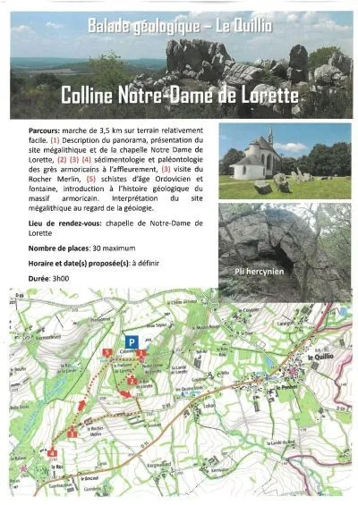 Parcours: marche de 3,5 km sur terrain relativement facile. Description du panorama, présentation du site mégalithique et de la chapelle Notre Dame deLorette, sédimentologie et paléontologie des grès armoricains à l’affleurement, visite du Rocher Merlin, schistes d’âge Ordovicien et fontaine, introduction à l’histoire géologique du massif armoricain. Interprétation du site mégalithique au regard de la géologie.Lieu de rendez-vous: chapelle de Notre-Dame de LoretteNombre de places limité, sur inscription à partir du 1er juin.