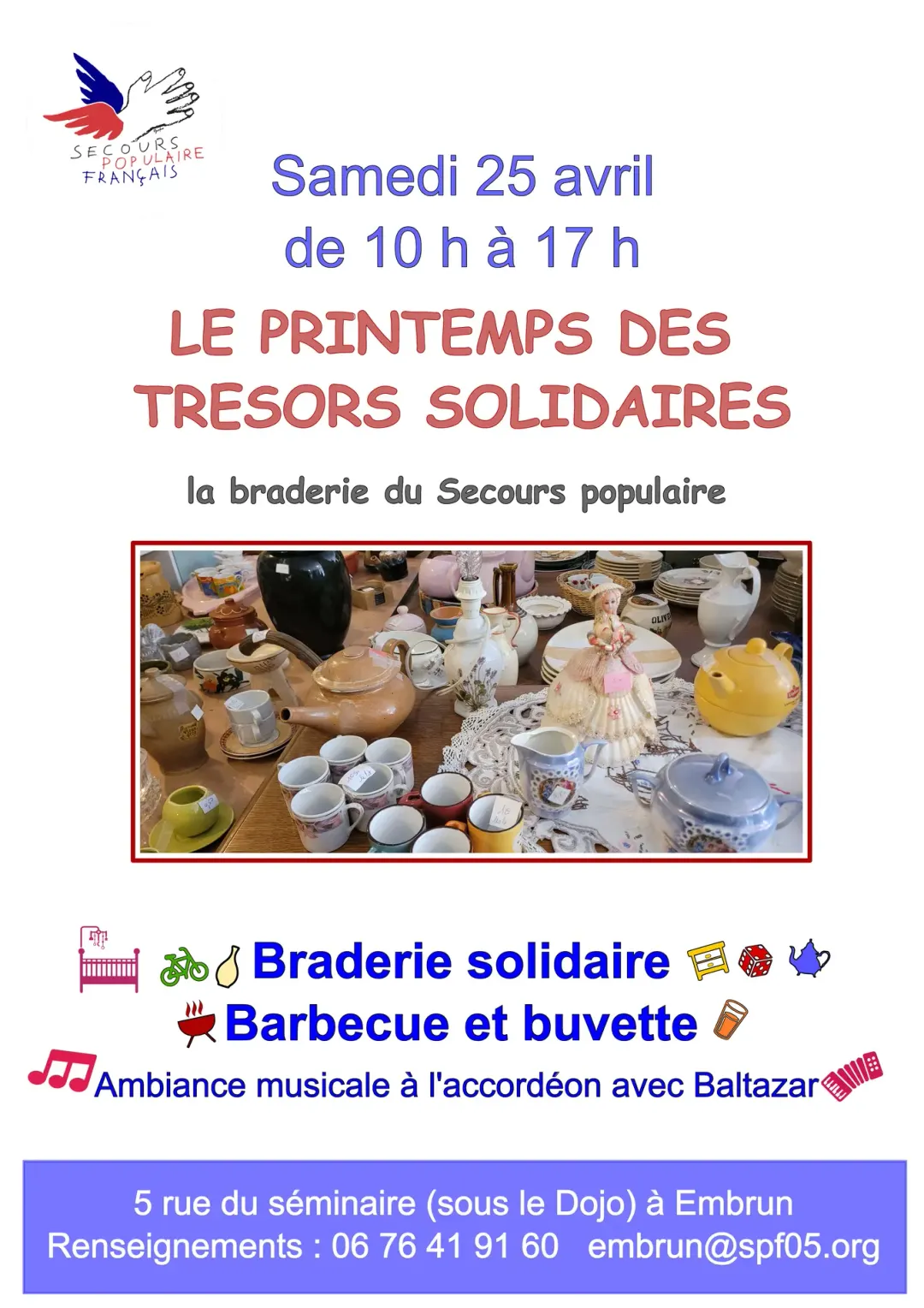 Braderie solidaire proposant une grande variété d’objets à petits prix : vêtements, livres, articles de maison, jeux et bien plus encore. Tous les bénéfices seront reversés aux actions du Secours populaire afin de soutenir les personnes en situation de précarité. Venez chiner, faire de bonnes affaires et participer à une initiative généreuse et conviviale.