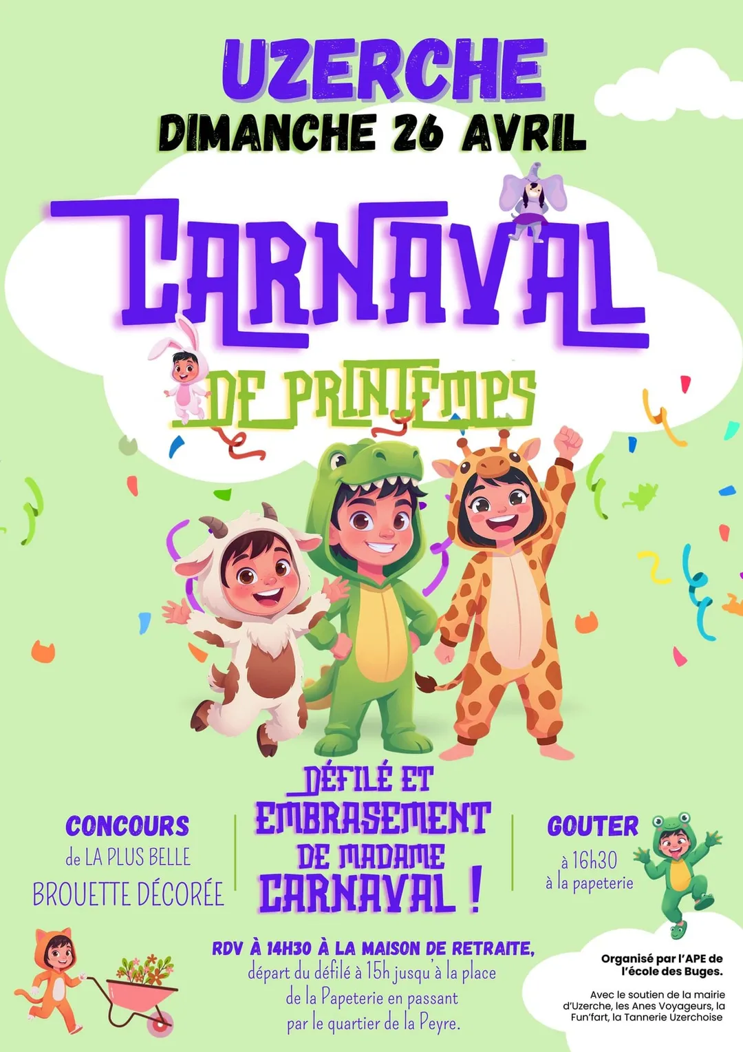L'APE de l'école d'Uzerche organise son carnaval. Rendez-vous à 14h30 devant la maison de retraite, départ du défilé à 15h jusqu' à la Papeterie, en passant par le quartier de la Peyre.