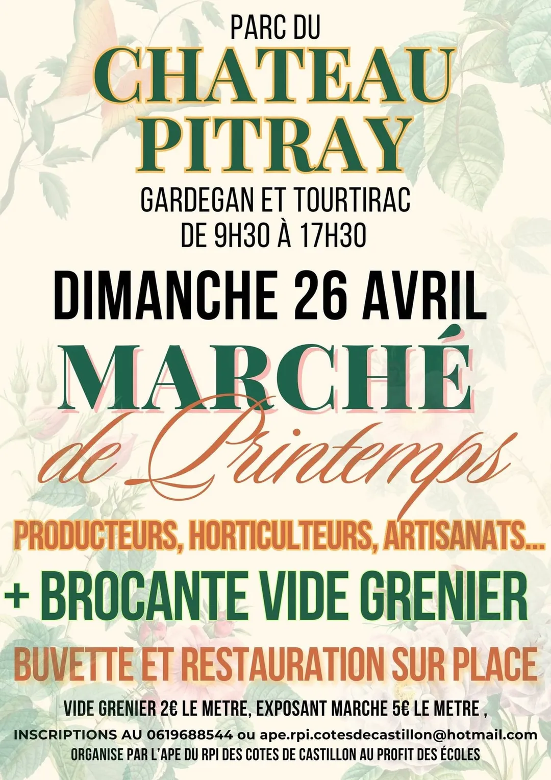 Venez nombreux pour exposer votre travail ou votre grenier, ou simplement pour vous promener dans le parc du château de Pitray !
