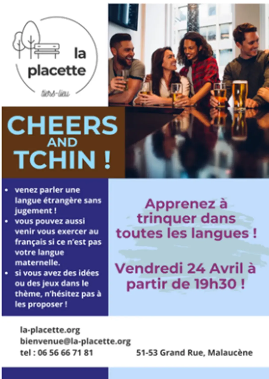 Venez converser et prendre un apéritif dans différentes langues étrangères : anglais, espagnol, allemand… en fonction des personnes présentes. Objectifs : parfaire ses connaissances, notamment à l’oral. Et, évidement, se rencontrer.