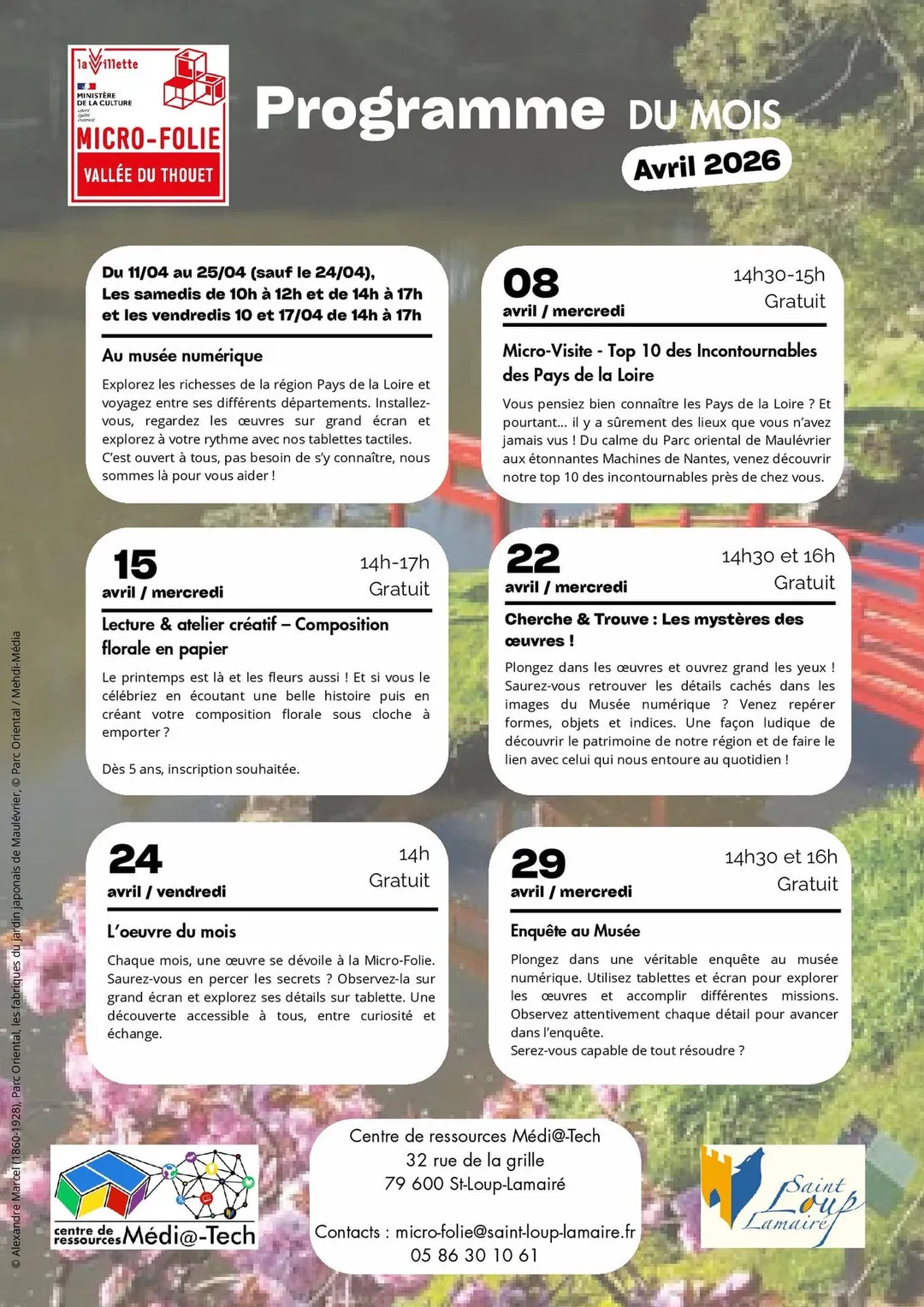 La Micro-Folie Vallée du Thouet est un espace culturel innovant qui propose un musée numérique, des ateliers d'arts plastiques et des activités au Fablab. Plongez dans les œuvres et ouvrez grand les yeux ce mercredi 22 avril ! Saurez-vous retrouver les détails cachés dans les images du Musée numérique ? Venez repérer formes, objets et indices. Une façon ludique de découvrir le patrimoine de notre région et de faire le lien avec celui qui nous entoure au quotidien ! Rendez-vous à 14 h 30 et à 16 h. En avril, une exposition sur les richesses des Pays de la Loire est également visible avec le musée numérique lors des ouvertures. Retrouvez le programme complet des animations dans les images. Rendez-vous à la Micro-Folie, au 32 rue de la Grille à Saint-Loup-Lamairé. Inscription au 05 86 30 10 61 ou sur micro-folie@saint-loup-lamaire.fr. Gratuit.