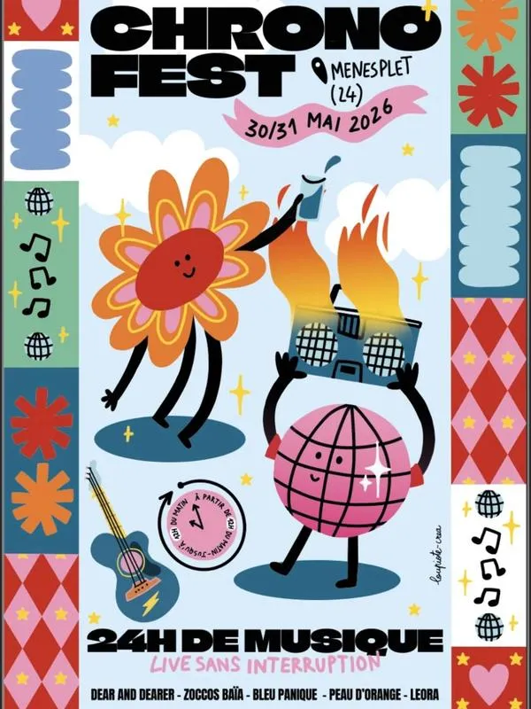 Chronofest du 30/05 à 12h jusqu’au 31/06 à 12h. Avec divers artistes- 24h de live sans interruption - Dear and Dearer, Zoccos Baia, Bleu Panique, Peau d'orange, Leora