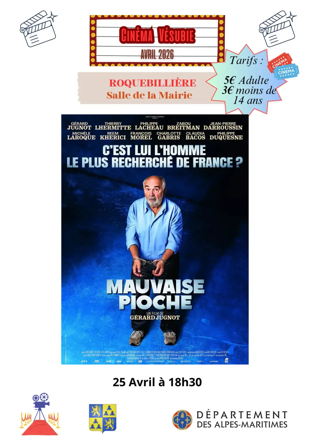 Projection du film "Mauvaise pioche", une Comédie, de Gérard Jugnot , par Gérard Jugnot et Frédéric Hazan, avec Gérard Jugnot, Philippe Lacheau et Thierry Lhermitte, d'une durée d'1h32min.