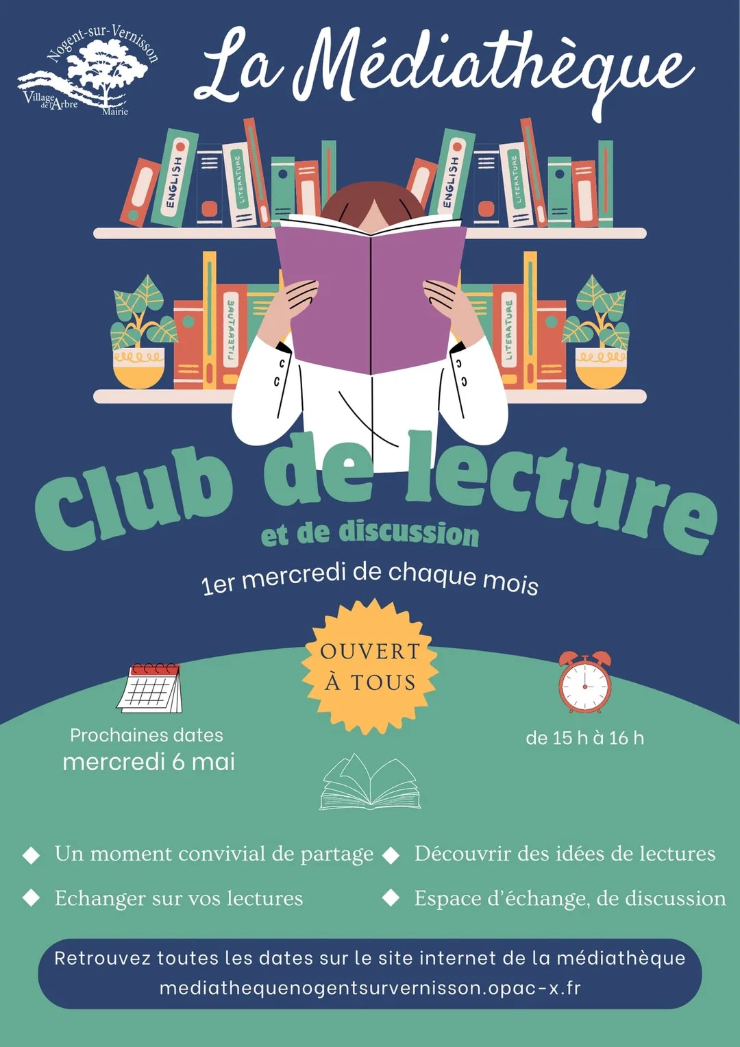 Club de lecture et de discussion à la médiathèque. Tous les premiers mercredis du mois. Un moment convivial ouvert à tous! Venez partager vos coups de coeurs, échanger autour de vos lectures, découvrir de nouveaux livres. Passionné de lecture, lecteur occasionnel ou simple curieux, le club de lecture vous propose ainsi un moment d'échange et de discussion dans une ambiance chaleureuse et détendue.