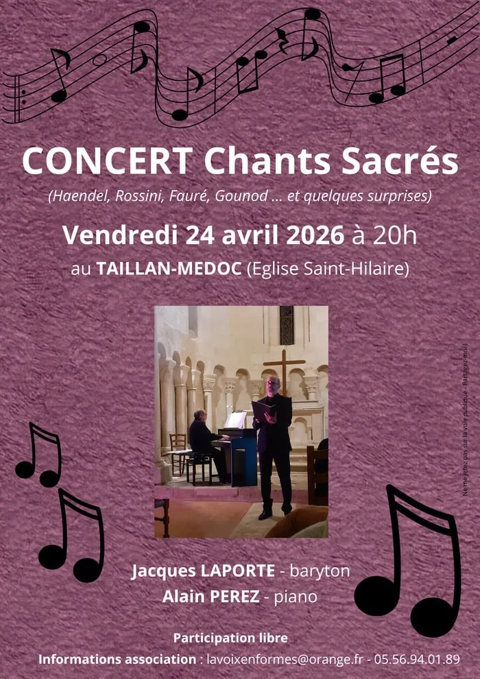 Le vendredi 24 avril 2026 à 20h, l'église Saint-Hilaire du Taillan-Médoc accueille un concert de chants sacrés proposé par l'association La Voix en Formes.