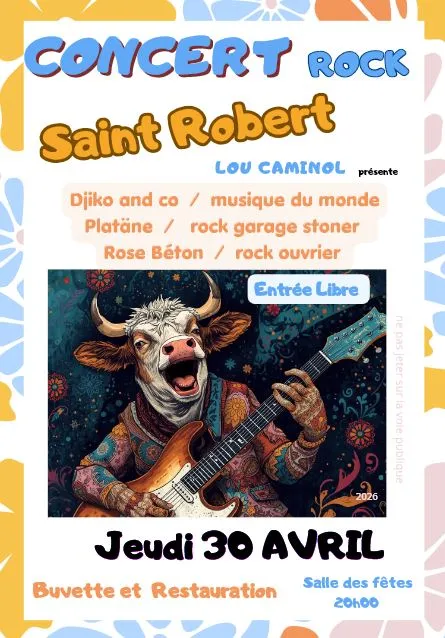 Lou Caminol présente son traditionnel concert rock pour la Saint Robert avec les groupes : Djiko and co (musique du monde), Platäne (rock garage stoner), Rose Béton (rock ouvrier).