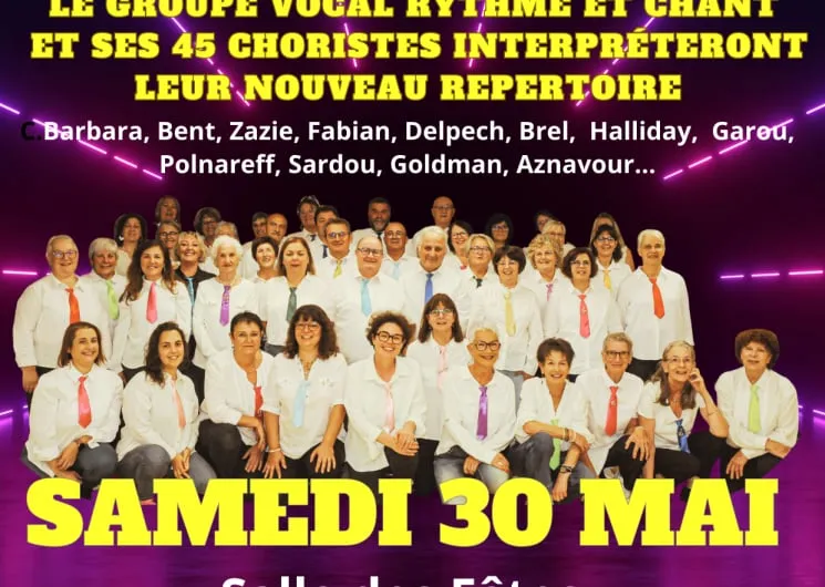 Le groupe vocal Rythme et Chant présente son concert annuel de variété française. Comme chaque année, la veille de la fête des mères à la salle des fêtes de Bagnac sur Célé.Cette année, nous avons décidé de faire plaisir au plus grand nombre en chantant lors de 2 concerts, 45 choristes, 15 chanteurs solos qui reprennent les succès de Amel Bent, Lara Fabian, Clara Luciani, JJ Goldman,Michel Sardou, Jacque Brel, Barbara, Johnny Halliday, Aznavour et bien d'autres….