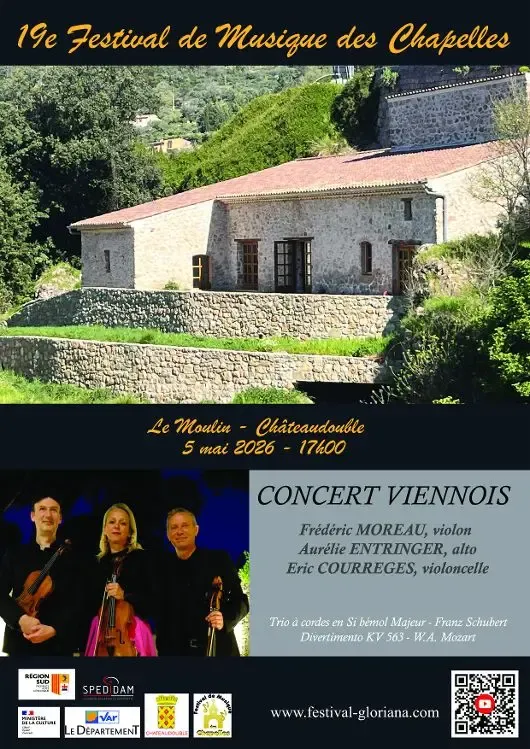 Trio à cordes en Si bémol Majeur D471, Franz Schubert Divertimento KV 563 de W.A. Mozart. Mardi 5 mai 17h00 Châteaudouble Église Notre-Dame de l'Annonciation.