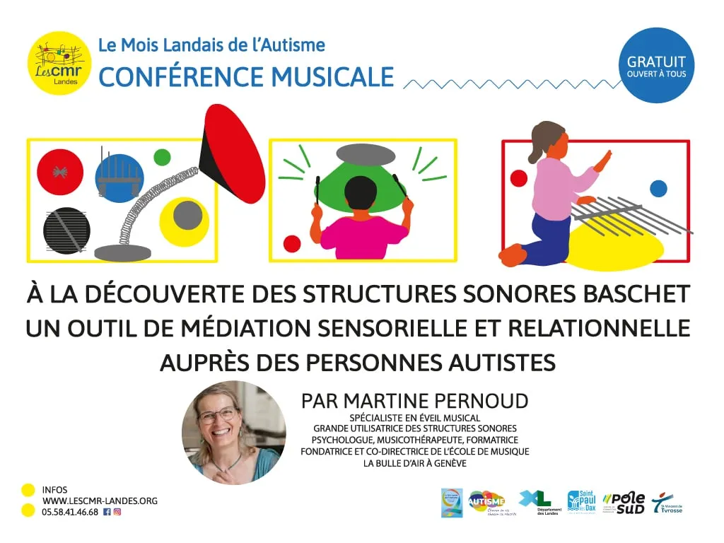 Cette rencontre sera animée par Martine PERNOUD, musicienne spécialisée en éveil musical, psychologue et musicothérapeute. Grande utilisatrice de ces instruments, elle est également cofondatrice et co-directrice de l’école de musique La Bulle d’Air à Genève.Au cours de cette conférence, Martine PERNOUD proposera des apports théoriques, des exemples de pratiques ainsi que des retours d’expérience, afin de mettre en lumière l’intérêt des Structures Sonores Baschet dans l’accompagnement des personnes autistes, au service du bien-être, de l’inclusion et de la qualité de la relation. Un temps sera consacré à la manipulation des Structures Sonores Baschet.Cette conférence est ouverte à toutes et tous : parents, professionnel.le.s de la petite enfance et de l’enfance, professionnel.le.s de la musique, adultes curieux ou mélomanes.