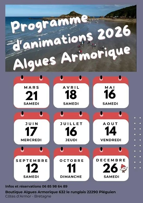 Algues Armorique vous propose une balade à marée basse de 2h pour découvrir les algues suivie d’un atelier culinaire pour une découverte gustative et des idées recettes! Réservation obligatoire. Horaires en fonction des marées.