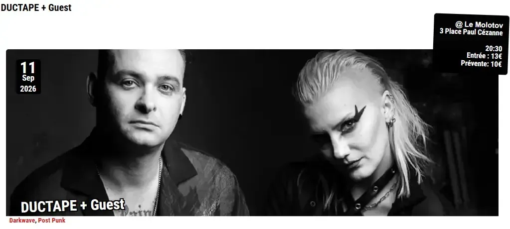Réputé pour ses performances énergiques et chargées d’émotion, avec des morceaux à l’atmosphère envoûtante, Ductape s’est rapidement fait connaître sur la scène post-punk et gothique mondiale. Depuis ses débuts, le groupe a sorti quatre albums et deux EP, se constituant progressivement un public international passionné.