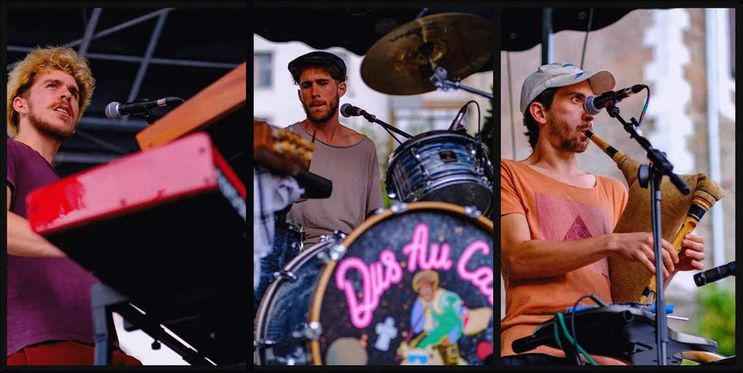 Dus Au Casau, ce sont trois frères qui se frottent à leurs racines pyrénéennes, tout en flirtant avec l’immensité du monde quitte à voir plus loin ! Leur projet : faire danser le bal aux amateurs de techno, mettre des paillettes aux bérets des bergères, faire sonner la cornemuse landaise et le tambourin à cordes avec des synthétiseurs multiverses. Les mélodies traditionnelles embrumées de boucles et de bourdons se mettent aux services des transes collectives. Les textes du patrimoine, en oc, délibérément arrangés, parlent d’amour et de résistance. Avec Marin Maffrand (claviers, synthétiseurs, voix), Théo Maffrand (batterie, tambourin à cordes, voix) et Baptiste Maffrand (accordéon diatonique, cornemuse landaise, guitare-tambourin, voix).