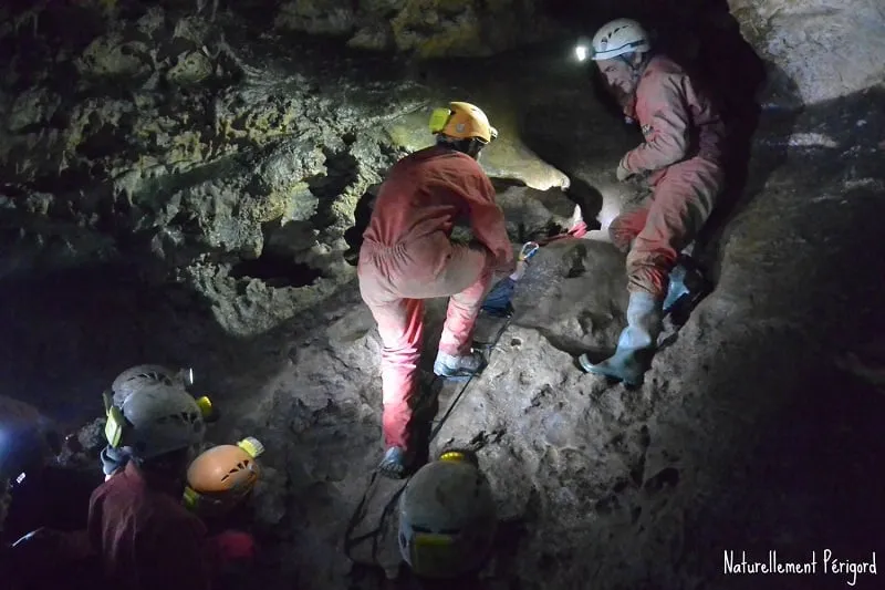 Initiation à la spéléologie en cavité naturelle, encadrée par un professionnel diplômé avec matériel et combinaisons fournies.