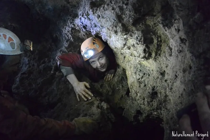Initiation à la spéléologie en cavité naturelle, encadrée par un professionnel diplômé avec matériel et combinaisons fournies.
