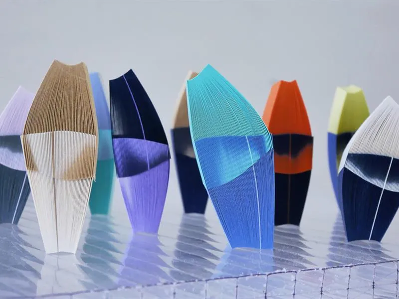 Quant à elle, la série de sculptures Estratu se compose de feuilles de papier découpées en lamelles, amassées puis assemblées aux extrémités par une technique de reliure de livre.