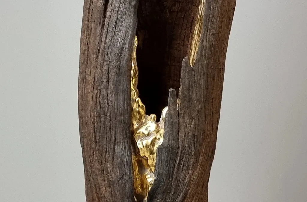 Les reflets de l’or se lovent au creux le plus intime, ou glissent à fleur de peau des branches brutes, écorces, troncs d’arbres, glanés avec émotion pour raconter, sublimer une blessure, révéler quelque secret de ces sculptures naturelles.