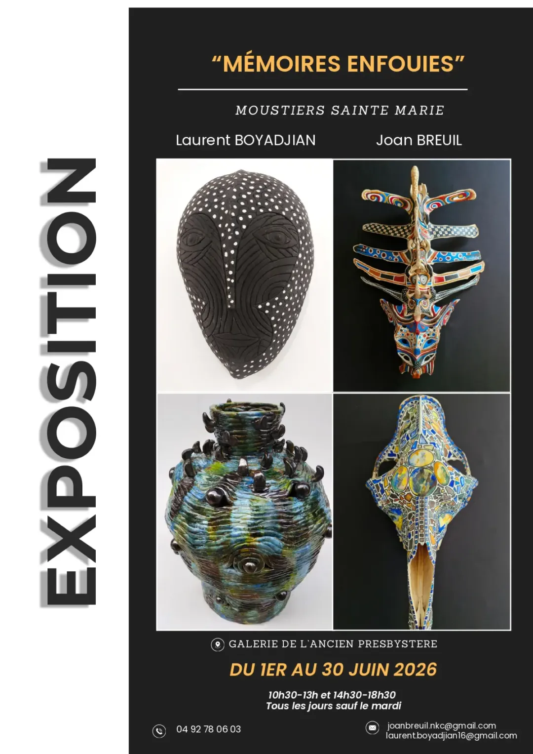 Du 1er au 30 juin 2026, venez découvrir l'exposition "Mémoires Enfouies" des artistes Laurent Boyadjian (céramique) & Joan Breuil (peinture sur os) à la Galerie de l'Ancien Presbytère.
