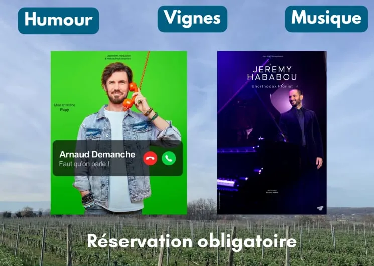 L’association Clap de Vin a le plaisir de vous présenter le seconde édition du festival. il se déroulera au coeur des vignes avec au programme de l’humour et de la musique ! Vendredi l’humoriste Arnaud Demanche et samedi le pianiste Jérémy Hababou.