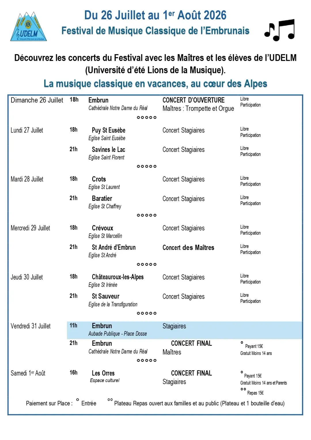 Pour les amateurs de Musique Classique, concerts réalisés par les Stagiaires et les Maîtres dans le cadre du Festival de musiques classiques de l'Embrunais.