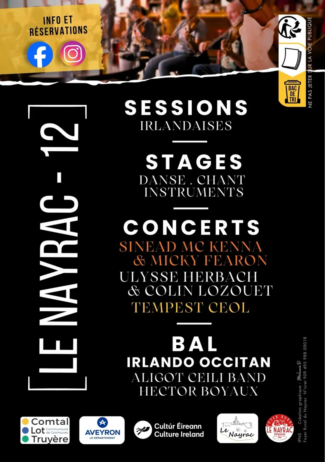 Prêts à vivre un week-end inoubliable de musique, de danse et de convivialité au cœur de l’Aveyron ? Réservez dès maintenant vos places pour le Festival Eire in Nayrac, du 22 au 25 mai 2026 ! Au programme: Des concerts de renommée internationale : avec notamment la violoniste Sinéad McKenna (nominée aux RTÉ Folk Awards 2025) accompagnée de Micky Fearon le vendredi soir. Mais aussi le groupe Tempest Ceol et le duo Herbach-Lozouet le samedi. Des stages de transmission : chant, danse, instruments. Des sessions irlandaises : ouvertes à tous les musiciens. Buvette & restauration sur place Venez partager la convivialité, la musique et la danse dans un cadre authentique ! On vous attend nombreux !