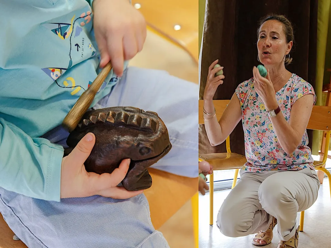 Avec Emmanuelle, professeur d’éveil musical Jaëll - Montessori et auteur jeunesse Montes-sori approche sensorielle de la musique, découverte de petits instruments de percussion adaptés à la main de l’enfant.
