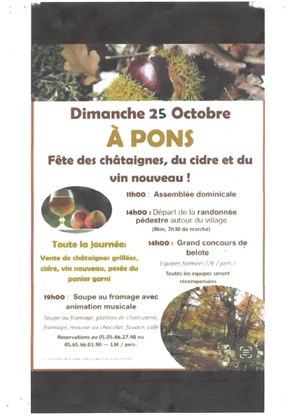 Randonnée, concours de belote, soupe au fromage. Toute la journée : vente de châtaignes grillées, cidre, vin nouveau, pesée du panier garni