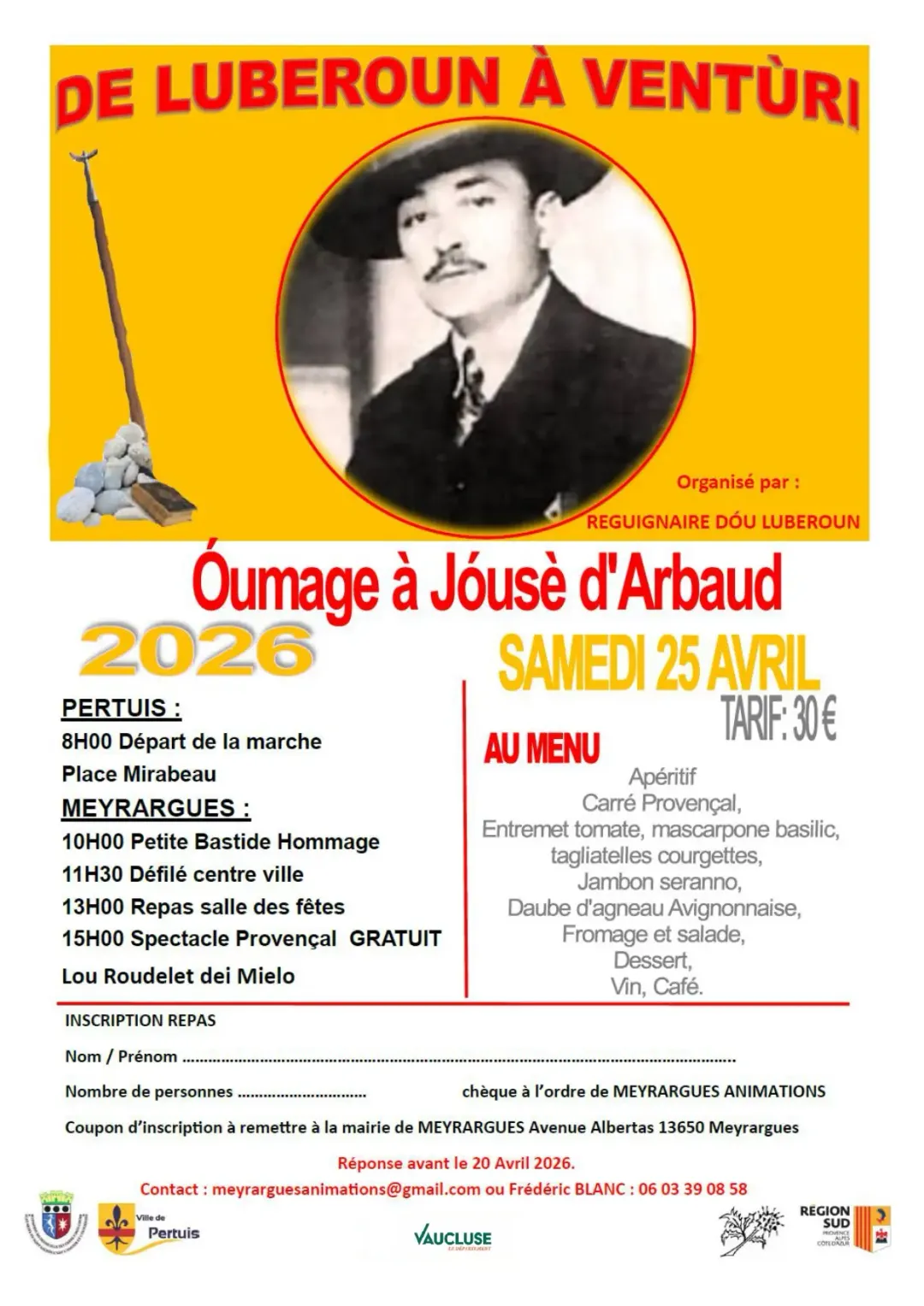 Le Samedi 25 avril 2026, Li Reguignaire dóu Luberoun avec la Municipalité de Meyrargues, organisent le 26 ème anniversaire de l'action « De Luberoun à Ventùri » .