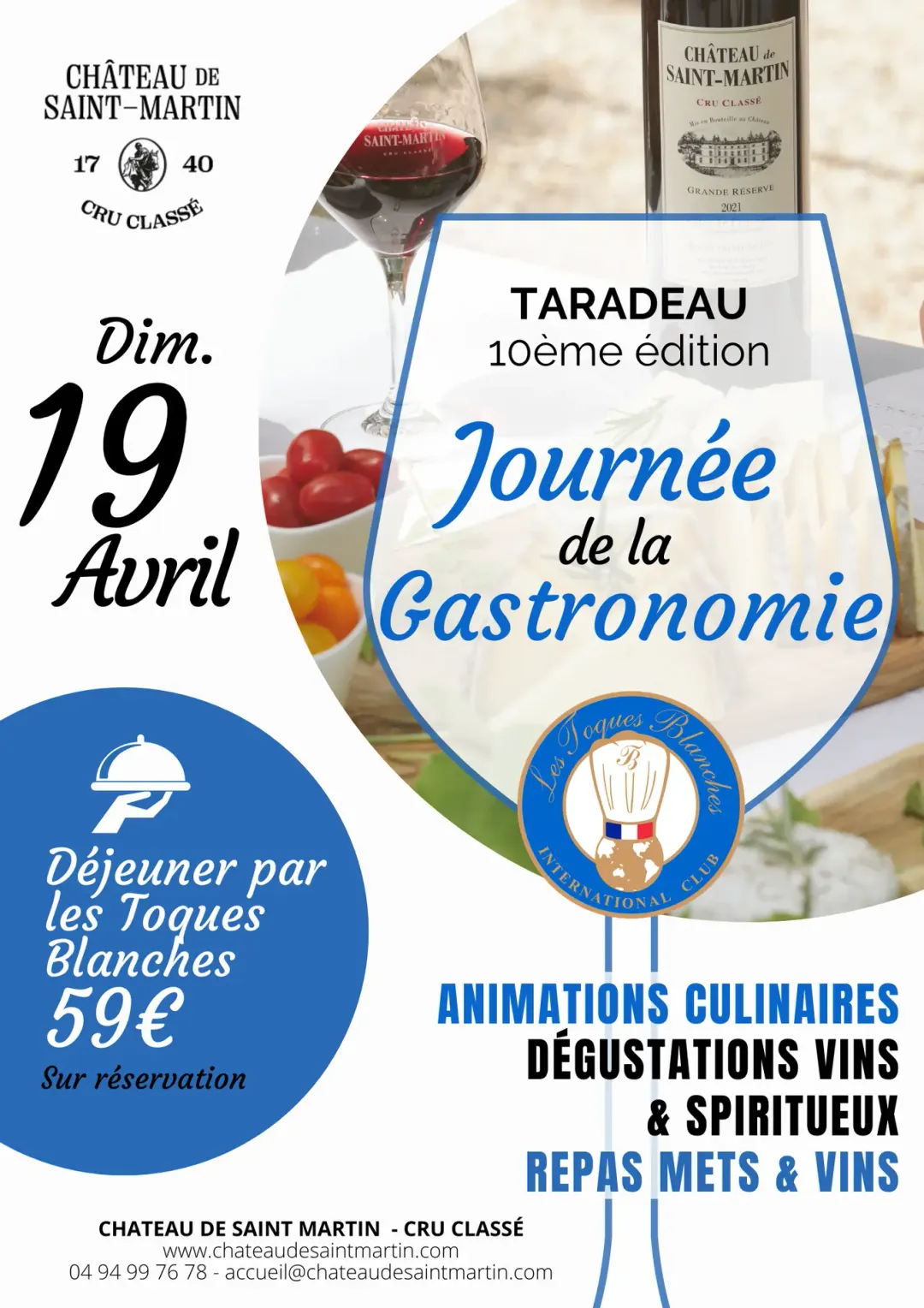 A 12H30 : Déjeuner élaboré par les Chefs de l’association des Toques Blanches Côtes d’Azur, en accord mets & vins du Château de Saint Martin