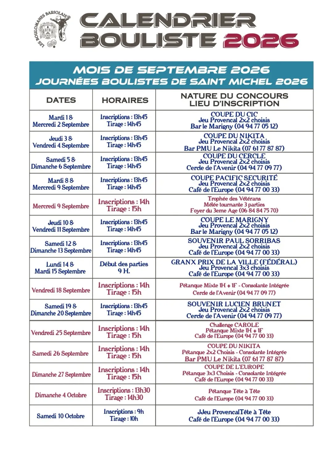 > 13h45 : Coupe du Nikita : Jeu provençal 2x2 choisis, inscriptions au bar le Nikita