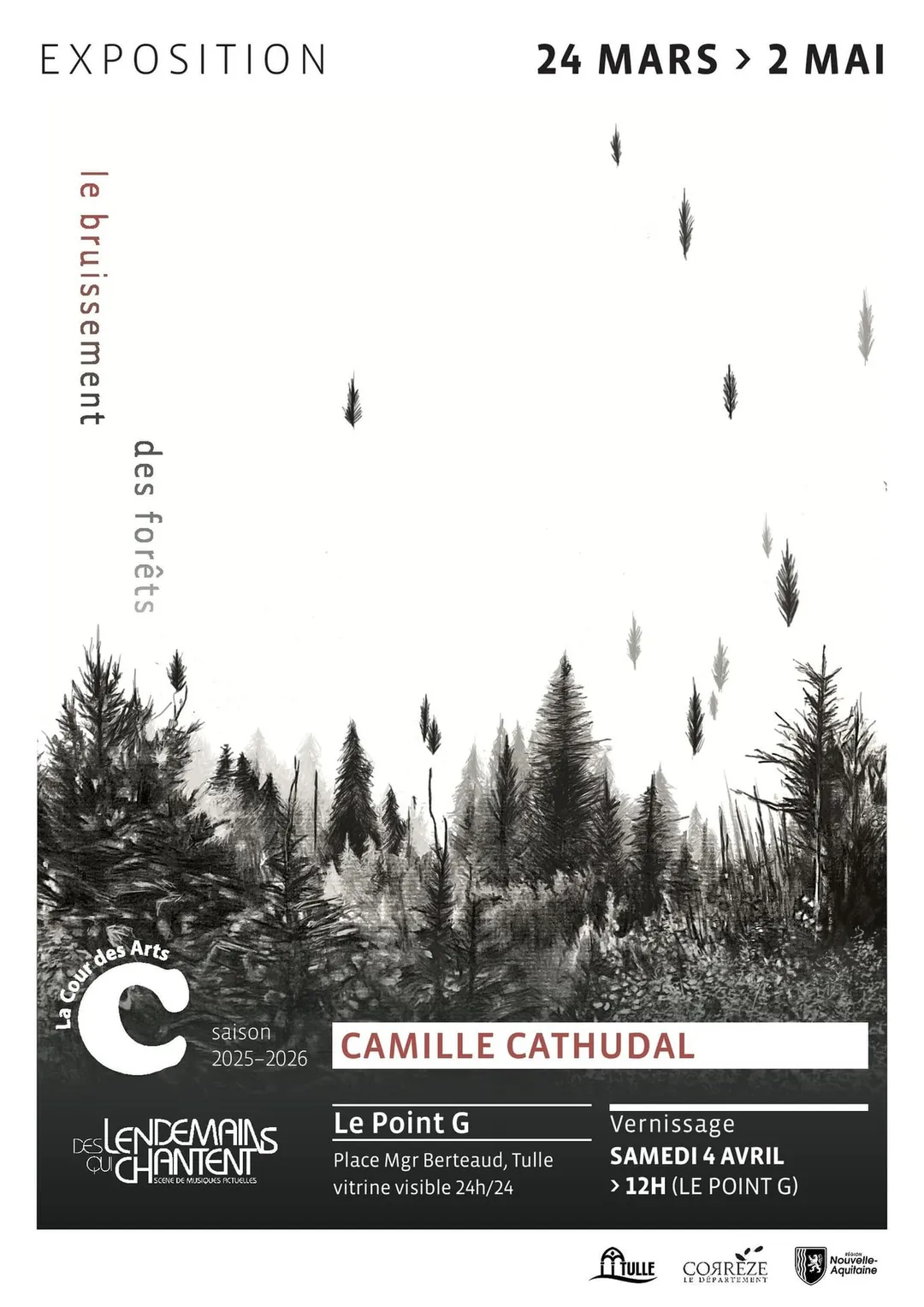 Camille Cathudal décline ses dessins au graphite en série, en deux mais aussi en trois dimensions. Parfois directement issues d’un « espace mental » ou s’appuyant sur l’histoire ou sur l’actualité, ses créations montrent des paysages qui se situent souvent à la frontière du réel et de l’imaginaire. Dans un univers marqué par les nuances de gris du graphite, la couleur est rare, partielle, discrète mais toujours chargée de sens. Imprimée sur le dessin par sérigraphie, elle renvoie à une temporalité, un élément invisible, un nouveau prisme pour lire l’image. Une figure humaine parfois émerge, vient ponctuer une série de paysages comme autant d’autoportraits témoins, flottants, dans des espaces sans perspectives.