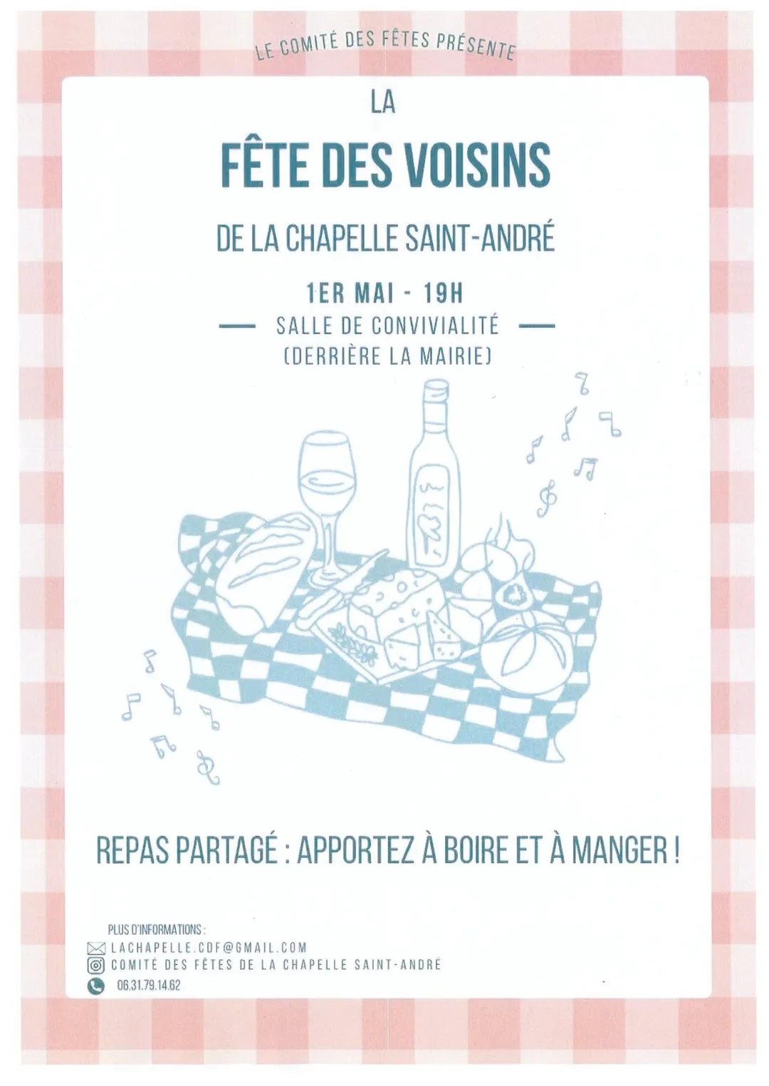 Le comité des fêtes présente : La fête des voisins de la Chapelle-Saint-André – Repas partagé : apportez à boire et à manger ! Infos : lachapelle.cdf@gmail.com