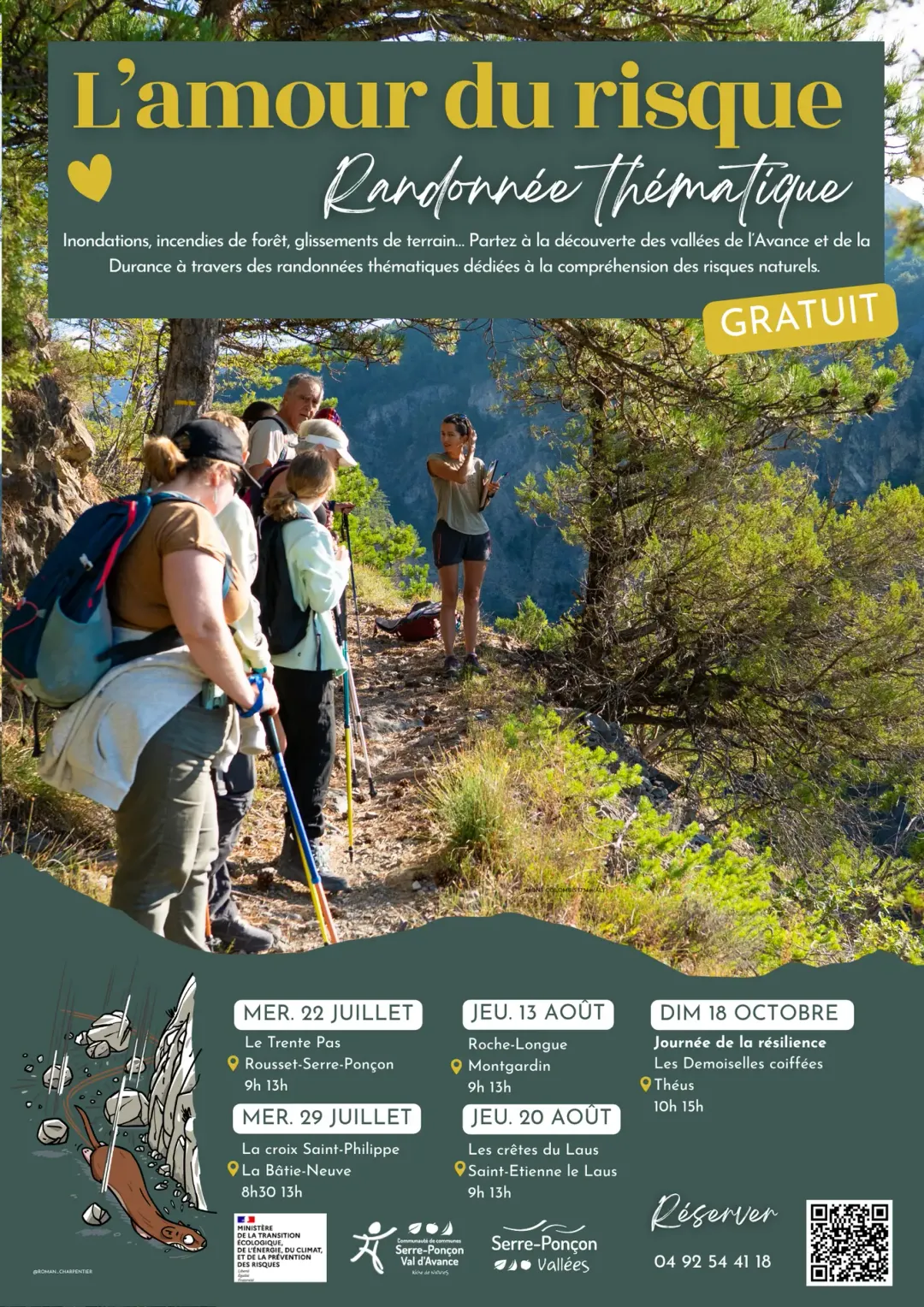 Inondations, incendies de forêt, glissements de terrain… Partez à la découverte des vallées de l’Avance et de la Durance à travers des randonnées thématiques dédiées à la compréhension des risques naturels. Ces balades pédagogiques vous invitent à explorer les traces visibles de ces phénomènes au fil du temps et à apprendre les comportements à adopter pour mieux s’en protéger.