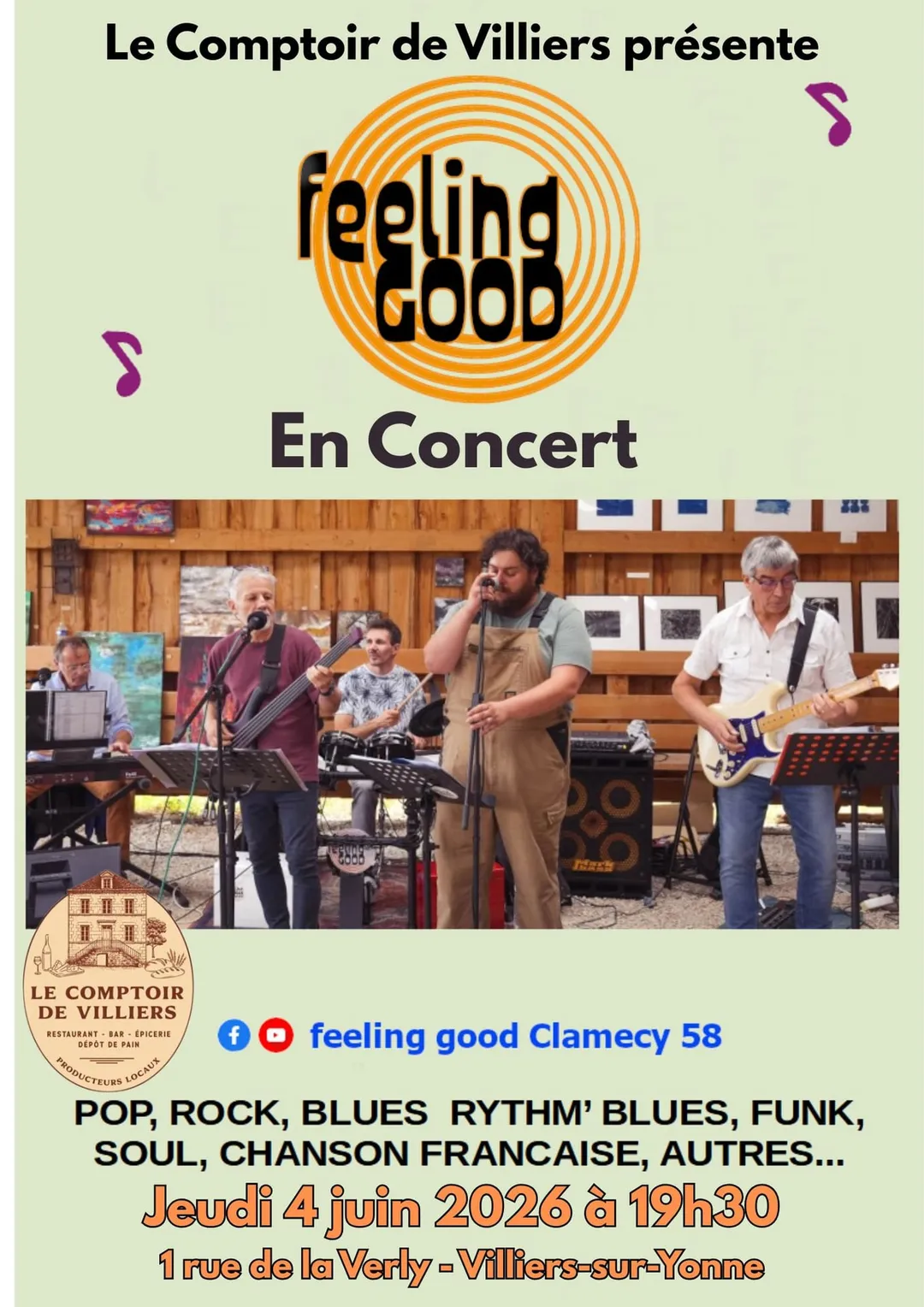 Le Comptoir de Villiers présente : Feeling Good en concert - Cinq gars du pays qui chantent des reprises à leurs façons... Funk, Soul, Chanson française, Pop, Rock, Blues, Rythm'blues