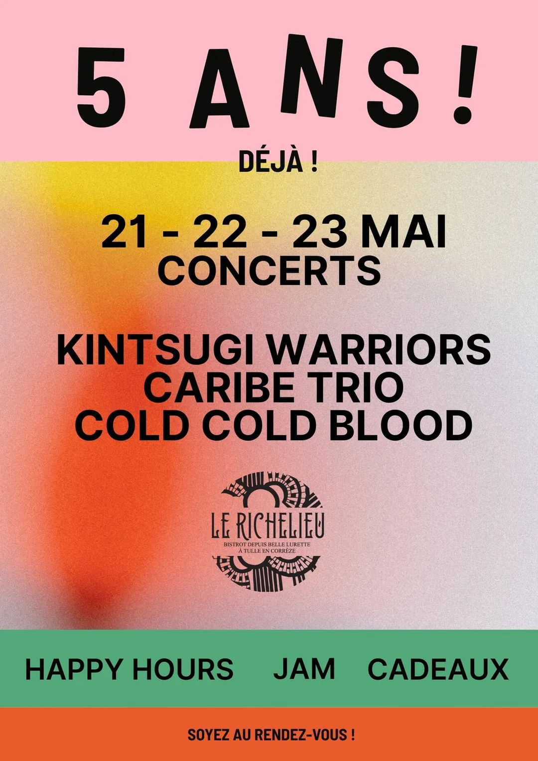 Concerts : Kinsugi Warriors - Caribe Trio - Cold Cold Blood - Happy Hours Jam Cadeaux - Soyez au rendez-vous -