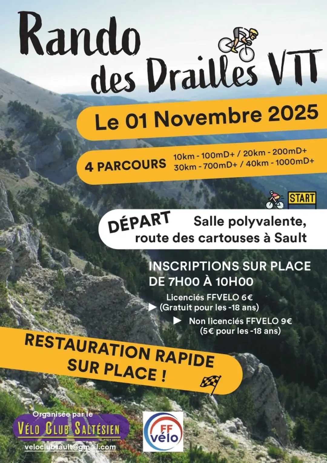 4 parcours sur les "drailles" du pays de Sault alliant la balade à la technicité balisé par le vélo club saltésien. Les vététistes tous niveaux seront comblés par ces boucles sur chemins et sentiers au coeur d'une nature parée de ses couleurs d'automne.
