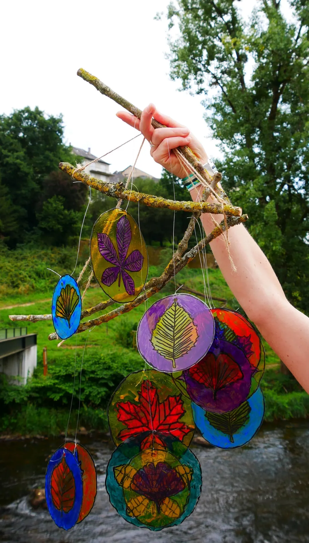 Création d'un mobile à suspendre avec la technique du vitrail. Pour ne pas se couper, on utilise une matière plastique souple et facile à découper, sur laquelle on choisit des motifs et des couleurs peintes avec de la peinture vitrail.