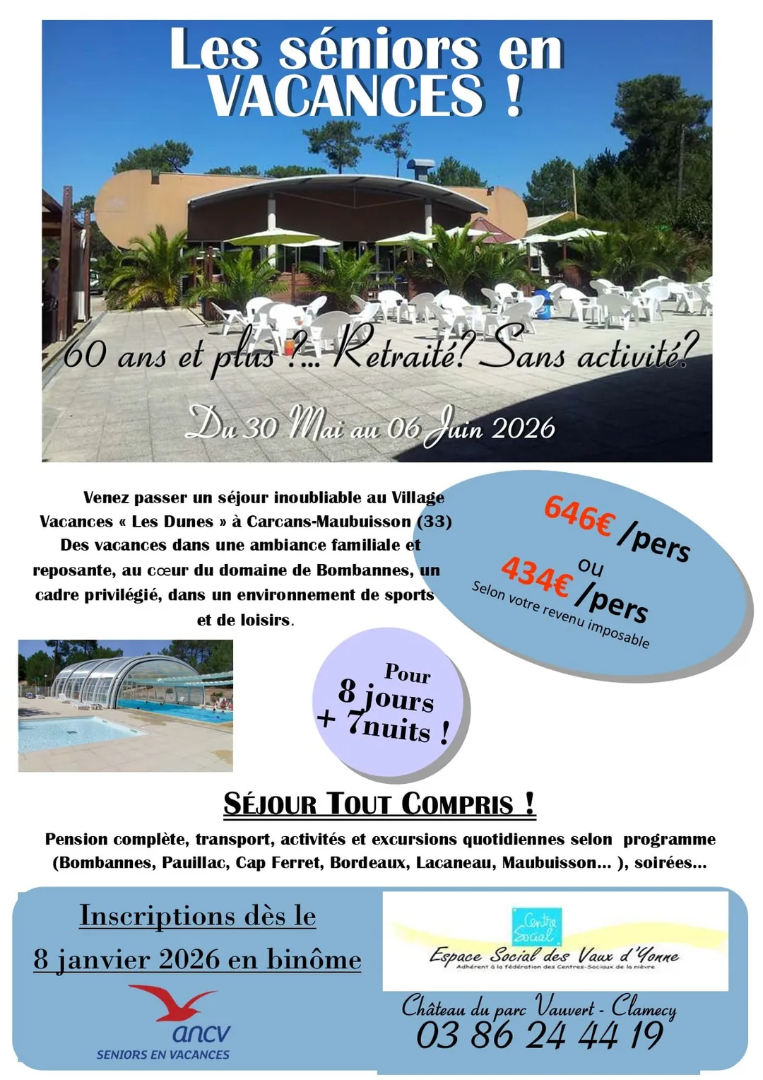 L'Espace Social des Vaux d'Yonne organise un séjour pour les séniors du 30 mai au 6 juin 2026 au Village Vacances "Les Dunes" à Carcans-Maubuisson (33) - Pour 8 jours et 7 nuits - Des vacances dans...
