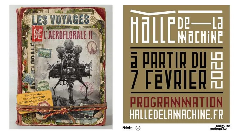 En 2026, la gigantesque serre volante de l’Aéroflorale II atterrit à la Halle de La Machine. À partir du 7 février, Les Voyages de l’Aéroflorale II présente les récits d’aventure de l’étrange aéronef et de son laboratoire scientifique.